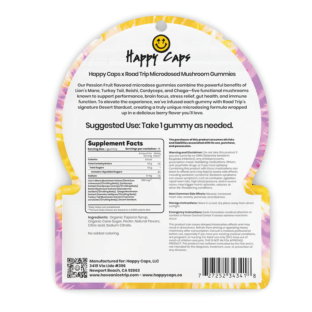 Happy caps gummies for sale, each pouch includes 14 gummies. Our Passion Fruit flavored microdose gummies combine the powerful benefits of Lion’s Mane, Turkey Tail, Reishi, Cordyceps, and Chaga—five functional mushrooms known to support performance, brain focus, stress relief, gut health, and immune function. To elevate the experience, we’ve infused each gummy with Road Trip’s signature Desert Stardust, creating a truly unique microdosing formula wrapped up in a delicious passion fruit flavor you’ll love.